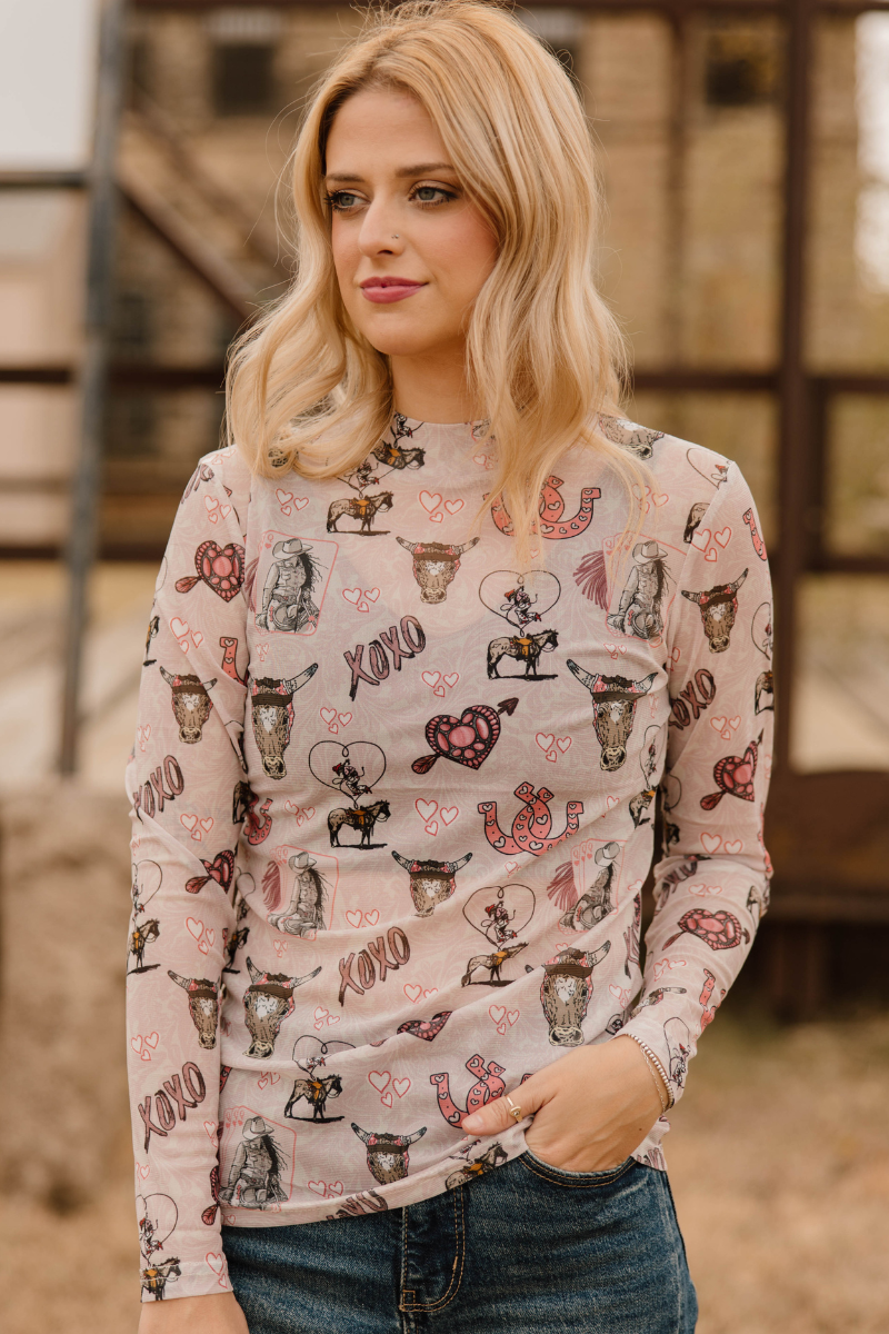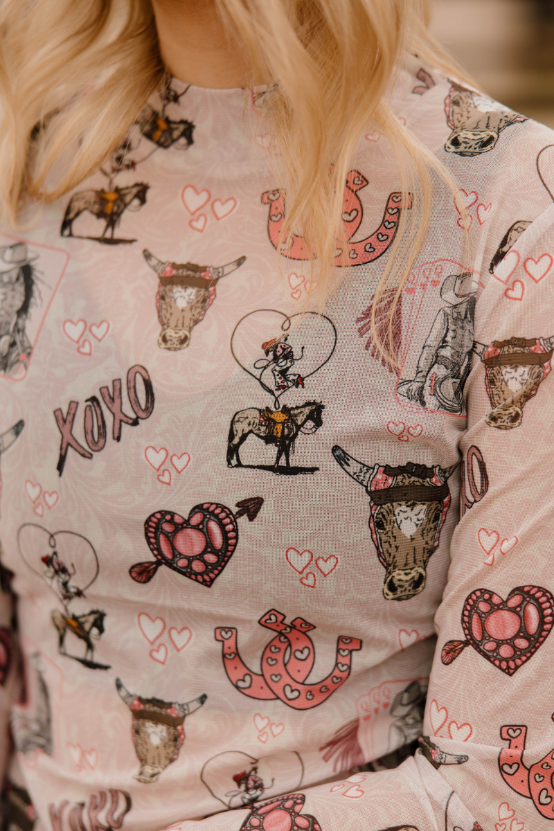 Show your rodeo passion with the XOXO Rodeo Mesh Top, designed to captivate with its romantic Valentine’s theme. Featuring delicate horse shoes, heartfelt “XOXO” details, and an inspiring image of a girl creating a heart with her horse through rope tricks, this mesh top combines style and sentiment. Lightweight and eye-catching, it’s the perfect choice to express your love for horses and turn heads this Valentine’s Day. Don’t miss out on adding this unique piece to your wardrobe. 96% Polyester 4% Spandex